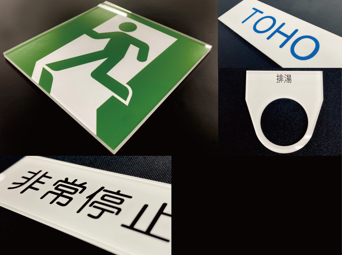 アクリル板などの表面・裏面に機械彫刻する方法と、シルクスクリーン印刷する方法があります。ピクトサインや表示ボードに適しています。